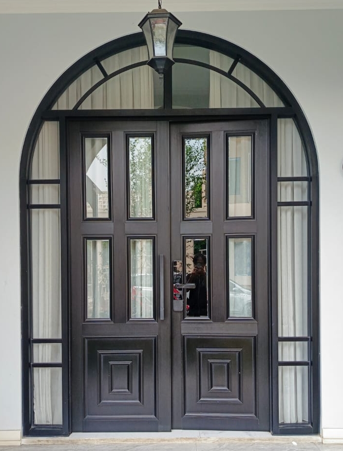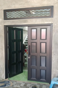 - Pintu satu daun: Model standar untuk pintu utama atau pintu kamar mandi. Contohnya, Aluminium Mahkota + ACP Motif ukuran 90 x 210 cm.
